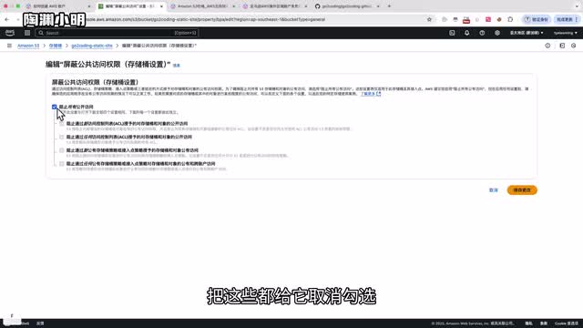 注意,要把里面的存储桶的名字换成自己的。这样存储桶中的对象就对所有人都可读了。点击保存,这里报了一个错,我们再次点击权限,然后编辑这个屏蔽公共访问权限,把这些都给它取消勾选。然后点击保存,在这个弹窗中输入确认,点击保存,然后我们再次点击编辑存储桶策略,把之前的那个jason再次粘贴进去,然后点击保存。可以看到这次就没有问题了。