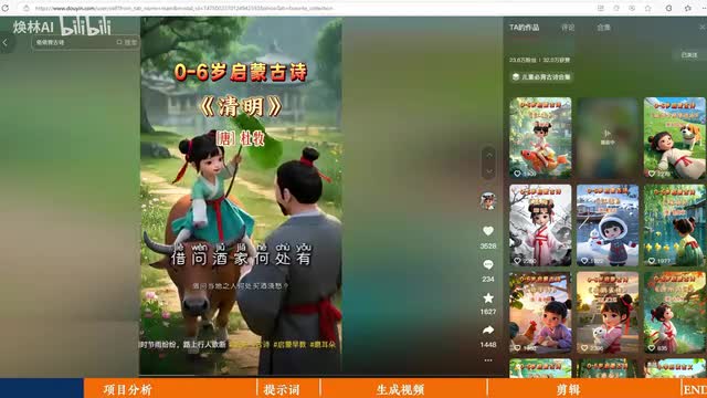 一天拆解一个a i玩法,今天拆解的是a i启蒙古诗,这种启蒙古诗视频怎么做?清明,唐,杜牧,清明时节雨纷纷,路上行人欲断魂。借问酒家何处有,牧童遥指杏花村。儿童启蒙类的内容,不管是启蒙古诗,还是启蒙英语、睡前故事,这种儿童题材的流量都是嘎嘎的萌,非常适合自媒体副业的朋友。