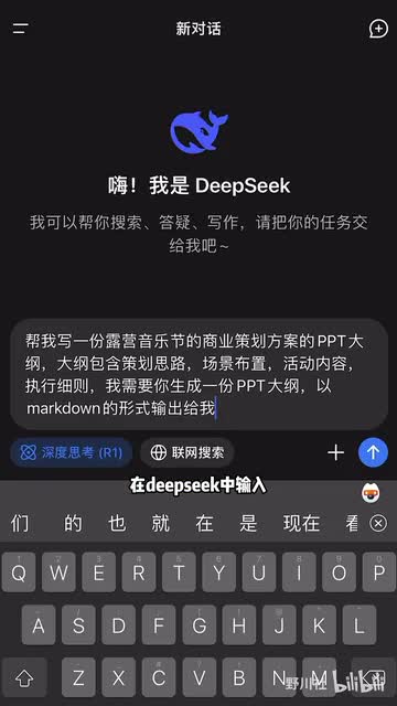 用画布编辑,将上面的文字抹掉,再放置自己的文字编排,整个过程完全不用动脑,过去一天出一百张图的梗已经笑不出来了,用deep sick帮我设计p p t,在deep sick中输入一份p p t的具体需求。我描述的是帮我写一份露营音乐节的商业策划方案的p p t大纲,包括策划思路、场景布置、活动内容,以markdown的形式输出给我,它就会快速帮你以markdown n的形式写出一份p p t内容。
