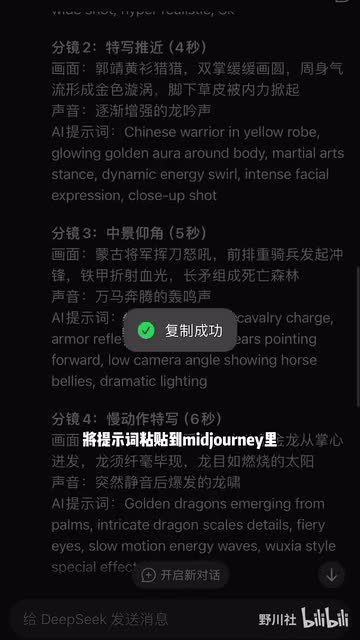 现在是一名导演,故事主要内容是武侠小说射雕英雄传中,郭靖被蒙古大军包围,使出降龙十八掌的功夫击退了敌人,请详细写出故事。分镜头描述,给出ai绘画的提示词,将提示词粘贴到迷你junior里,生成分镜头的画面,然后打开可能将图片导入到图像视频中,设置参数,点击生成,一个完全不懂电影的我就生成了分镜头的视频画面。