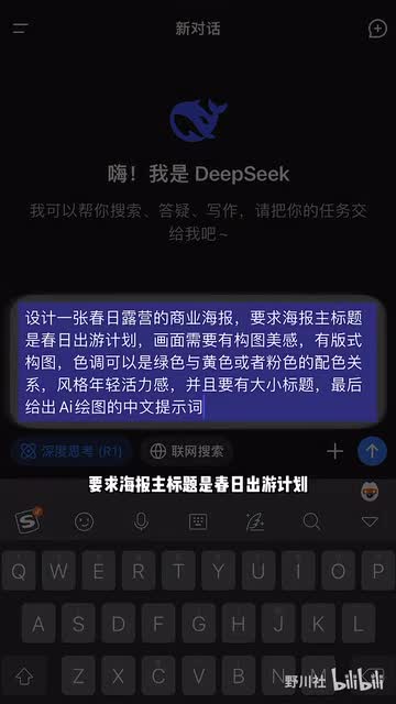 用deep sik辅助ai生成海报,打开deep sick,输入内容。设计一张春日露营的商业海报,要求海报主标题是春日出游计划,画面需要有构图美感,有版式配色,并且有大小标题,给出ai绘画的中文提示词deep sik或主动分析主题和设计过程。