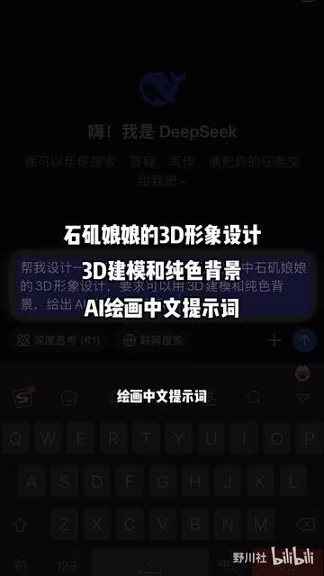 第一步打开deep sk输入内容,我描述的是帮我设计一个时机,娘娘的三d形象设计要求可以用三d建模绘画中文提示词。注意这里要打开r e和联网搜索,然后把给到的提示词直接复制下来。