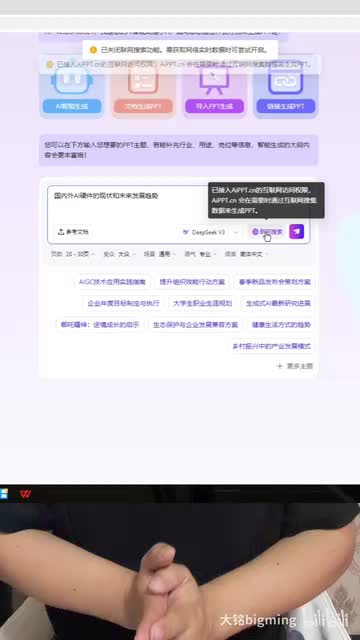 然后我们输入p p t的主题,国内外a i硬件的现状和未来发展趋势。这里面啊有一个功能,我觉得非常贴心。你看啊,它是可以根据你上传的文档和链接来生成p p t的。