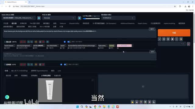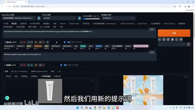 这段题词主要就是我们的一个产品,在一个纯净的一个天空背景下面,有一些五颜六色的花和橘子包裹这样的一个场景。当然选择增加了一个场景化的一个laura来增加画面的质感。在负面题词这里的话呢,我们可以选择一个常用的负面题词。