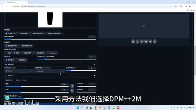 好,接下来我们来到生成参数当中,我们选择重绘门板区域,选择原图的处理方式,可以勾选柔和重绘。采用方法,我们选择d pm加加二尔们调度器,我们选择class的一个搭配,迭代步数可以拉到三十步以上。宽高度的话呢,我们可以适当的增大一点,我们可以调到一千左右。