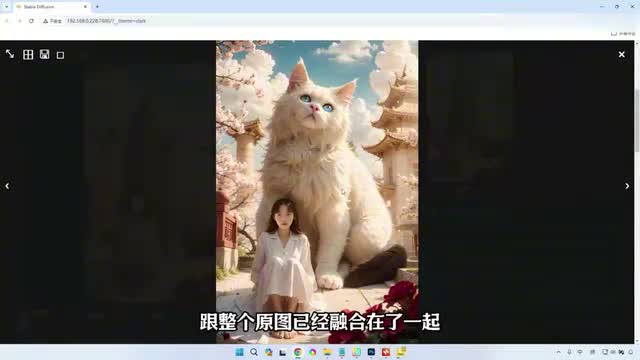 好,接下来的话呢我们回到上方点击生成来查看效果。好,我们可以查看一下效果,呃,效果非常不错。我们人物的一个光影跟整个原图已经经融合在了一起,没有了瑕疵。呃,然后我们整个画面的一个细节也得到了进一步的一个增强。这样的话我们的一个特色宠物的a i摄影就已经完成了。