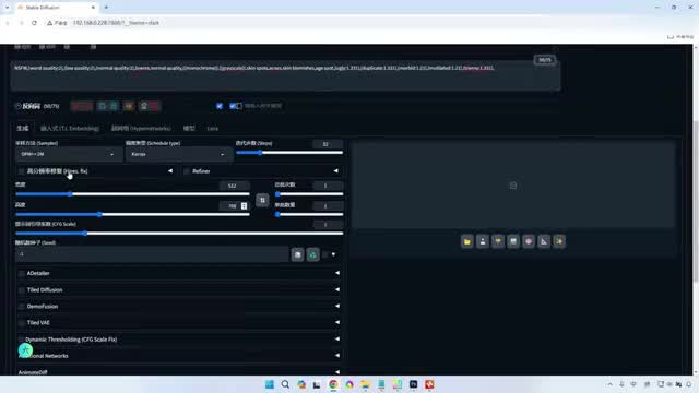 我们的一个迭代步数,我们调整到三十步左右。选择宽高度为五幺二乘以七六八。我们开启高分辨率修复。选择r e s四加的放大算法。重绘幅度的话呢,我们调整到零点四左右即可。