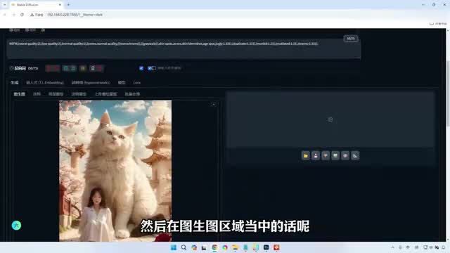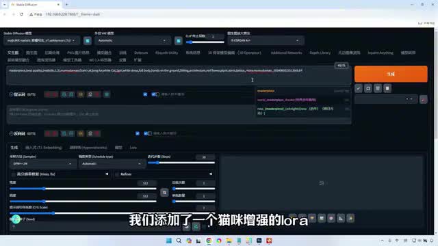 好,这个时候来到我们的一个c p d n当中啊呃来到我们的s d当中的画面。首先我们先去梳理一段我们自己调整好的提示词。这里的话呢我们添加了一个猫咪增强的同时填写一个我们常用的负面提示词。好在下方生成参数。这话呢我们选择叠排门加加二m加可拉式的一个组合方式。