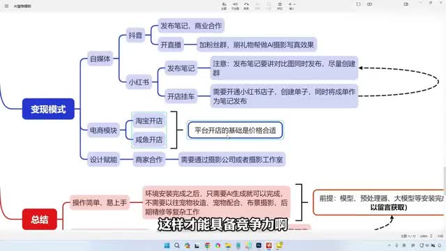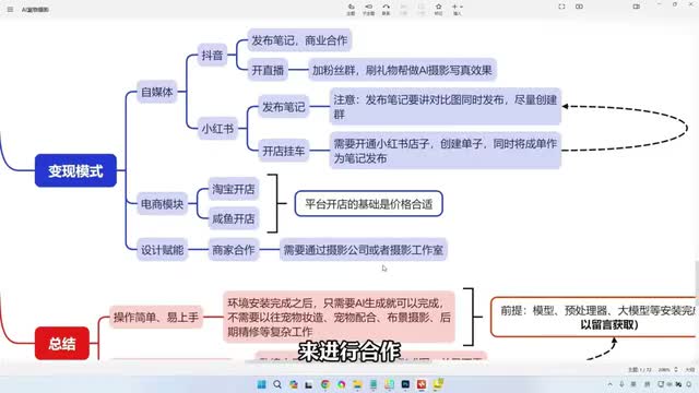 大家学会了没有?好,接下来的话呢我给它做一个总结啊,我们全程的整个操作的一个步骤,我已经用文档详细给它进行了一个记录啊,有需要的同学记得在下方评论留言来进行一个获取。好,当我们掌握了这样的一个a i宠物摄影的技能之后,我们应该通过什么样的一些方式来进行一些变现呢?这里我也给大家总结了一些变现的一些方法。呃,我们可以通过这么几个方式来去执行。比如说我们可以在自媒体当中去发表我们制作a i宠物摄影的这样的一些笔记。呃,抖音也好,小红书也好,都是可以进行的。