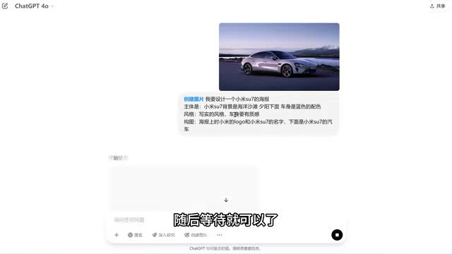 让g p t按照我们上传图片进行二次创作。我把我的想法描述给他,也可以按照刚才我们文生图所使用的描述方法,先描述主体风格构图分别是怎么样的,随后等待就可以了。一版的效果对比原图细节上还是有不少差距的,但是对比之前的那一版,细节上已经强上不少了。之后我又让a i换了一个场景,还是之前的场景,夕阳、沙滩、海洋,车身换成蓝色。