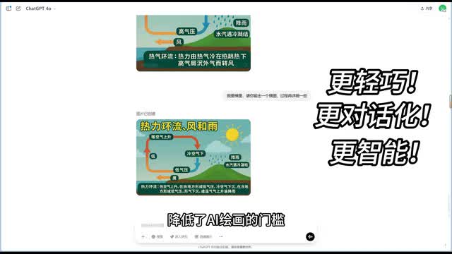 文字渲染利用a i设计一个a g i的logo,你可以边给指令边进行修改调整,这一切都是可以通过自然语言表述做到的,这个能力真的很厉害。不得不说,看起来还挺像那么一回事的。还有这种艺术字的风格迁移,这种简单的汉字效果还好,如果笔画稍微复杂一些,效果就很一般了。再比如说绘制的这个热力环流的过程图,文字上的效果其实很一般,但重点不在这里,热力环流的过程绘制的非常清晰,让人一目了然。