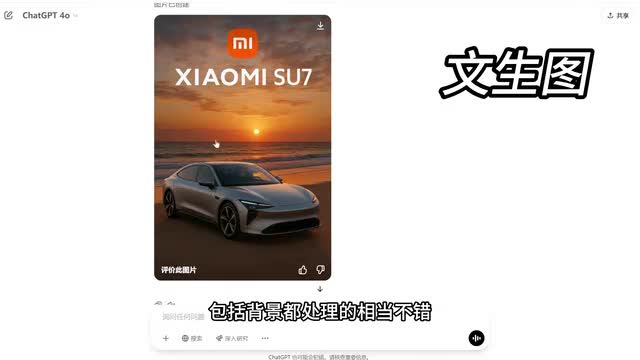 这些图都是通过最新升级的g b t四o多模态原生绘图做出来的,实测下来让我感到非常强大。众所周知,ai绘图主要是有两种方式,文生图和图生图文。生图说白了就是咱通过文字描述生成图片。如何让ai生成的更加符合我们预期呢?我认为主要是分为三个要素,比如说图片的主体是什么,生成图片的风格是什么样的,图片的构图是什么样的?举个例子,比如说我想设计一个小米舒淇的海报,我可以给a i这样描述,主体是小米苏颀,背景是海洋沙滩夕阳,下面风格是写实的风格,车身要有质感构图。