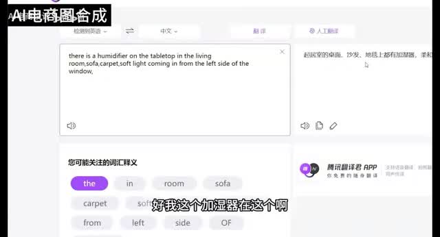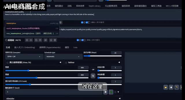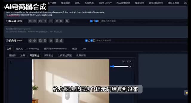 我会用到这个骑手室,在秋叶的这个s d的骑手包里面,它是自带的好一个高质量的图。然后呢这是我准备好的一段提示词。好,我这个加湿器在这个啊卧室里面、客厅里面哈有桌面、沙发、毛毯。还有一些柔和的光线,从这个仓库里面。射进来。