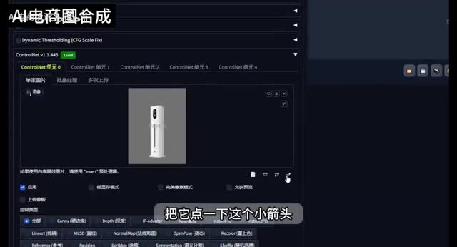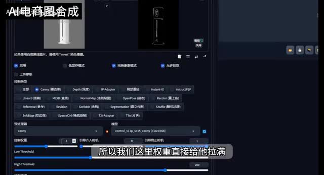 你可以看到产品的边缘被清晰的描绘出来。这样做的好处就是防止啊我们做出来的那张图的外形跟我们啊的产品不一样哈那这样的效果图就是没有用的那现在有了这个就可以控制它的外形了,所以我们这里权重直接给它拉满,改为一,这样子就不会超出我们的控制了。好,做完一切之后,我们再添加提示词。那在你做这张图的时候,一定要先预算好你想要什么样的一个画面,大概它是一个什么样的场景。你要先想好提示词。