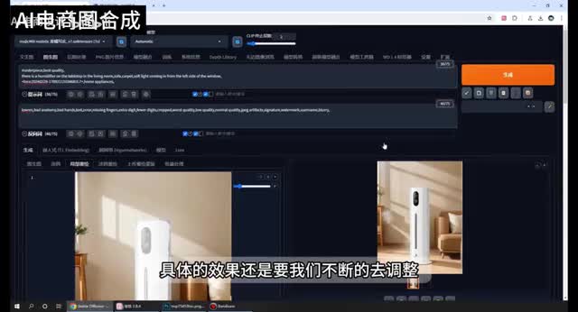 好,接下来再去生成一下。有了这个了之后,我们看到它的效果相对来说会更加的好了。那么这个就是我们生成的一个效果。当然如果你仔细看的话,你会发现哈这个产品的这个外观跟我们原来的产品外观它是不一样的。那我们做这个产品图的产品肯定是要跟我们的主图一样,不然就没有必要去用ai来去生成这个效果图了。