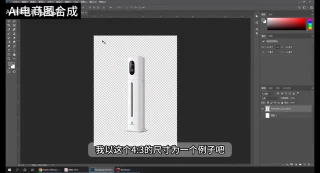 首先它是有一个我已经把它抠图抠的一个镂空的透明底的一个产品图哈,这是一个可以自由移动的产品。好,那么我们放在这个主图的尺寸。我以这个四比三的尺寸为一个例子吧。啊把这个产品图放在这个啊你想要摆放的这个位置哈。一般来说它可能是靠左、靠右或者靠中看你的一个设计排版的一个需求。
