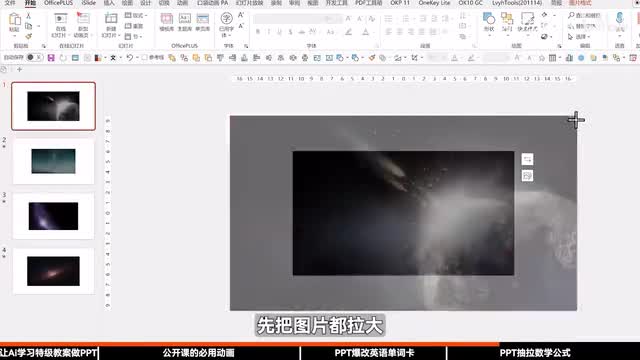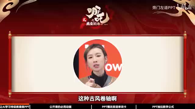 在第一页中把卷轴和图片都裁成细条拼在一起,就在切换里面呢添加平滑,就能做出拉开卷轴的效果。然后复制一页,把哪吒单独放大,其他的人呢缩小放在两边,把图片透明度拉到一百,放上文字,其他的人物也是同样的操作。最后选中所有的幻灯片。