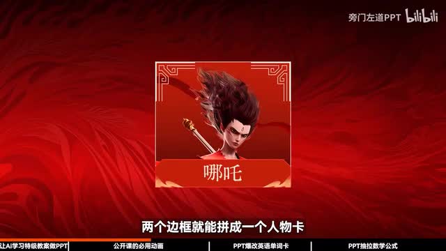 同样加上平滑的效果,在卷轴上介绍人物的效果就做好了。这种和课文人物串联的效果更简单。还是去这个网站搜国风边框,加p n g两个边框就能拼成一个人物卡,排列放在p p t的最下面,再把第一组人物并列放在中间,文案左右对齐各占一边,把对应的卡片往上移动,再把其余的人物图片的透明度拉高。