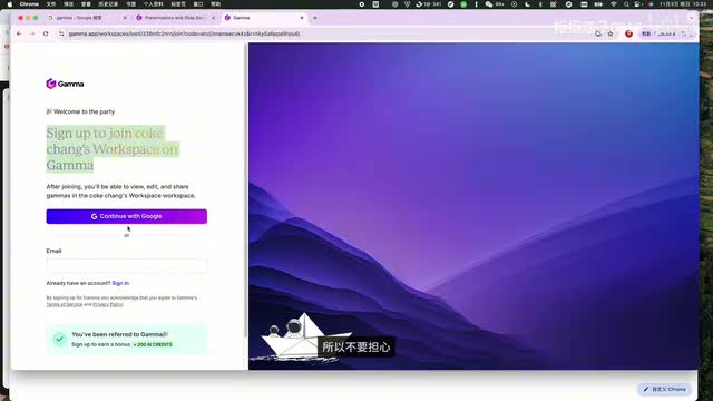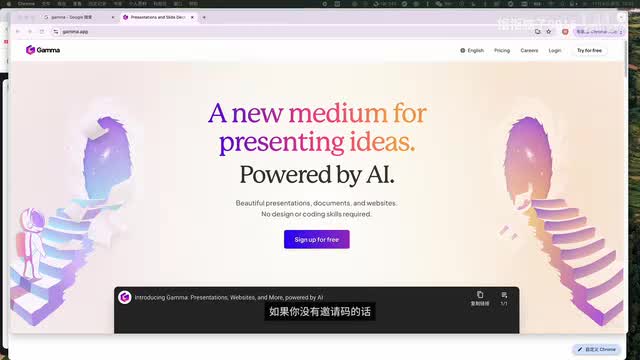给大家演示一个很多人都很熟悉的a i p p t工具,是国外top one的,叫做伽马。它可以帮助我们快速做p p t文档以及网页。如果你没有邀请码的话,你可以在他的官网直接点击log in去呃注册就好了。或者是你也可以用我的邀请码链接新建一个空白网页,把我的邀请码输入进去就可以了。