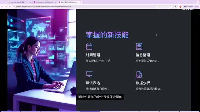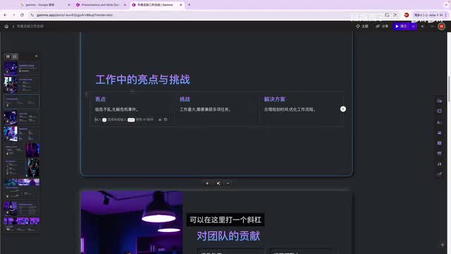 我们再来说一下伽马的适用场景,因为它的风格特别的强烈,他非常适合内部工作的总结,团队的展示或者是学习汇报等场景。如果你想要快速制作一个八十分的p p t的话,用伽马是很合适的。不过因为它的风格比较细分化,如果这个p p t展示的对象是国企或者是民企。偏保守型的客户的话,可能需要再斟酌一下是否使用伽马是合适的。
