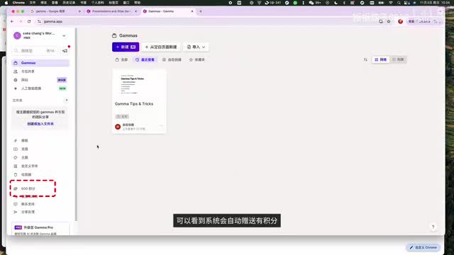 在你刚进来的时候,它会有一个小的调研,我们把它填一下就好了。可以看到系统会自动赠送有积分。这个系统原本是赠送三百个积分,现在可能涨了,涨到四百积分。那积分是怎么消耗的呢?你每次新建一个p p t文档或者是网页都会消耗四十个积分。