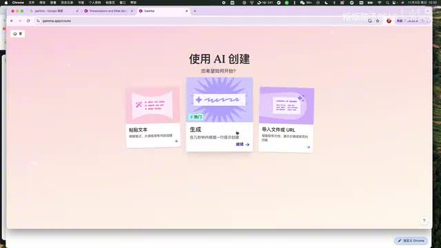 点击之后选择内容的生成方式,包含有。粘贴文本,可以把内容直接复制进去,可以上传文档或输入网页链接。伽马会提取网页内容生成p p t。我们在这里选择一句话生成p p t试一下。
