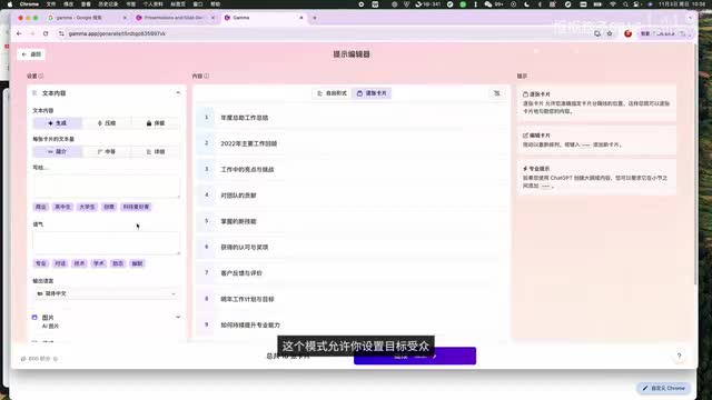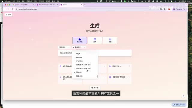 你还可以设置需要生成的卡片数量,比如说选择十张。同时伽马支持多个语言的操作,包括简体中文和繁体中文,是目前语言种类最丰富的a i p p t工具之一。我们还是以总部年终工作总结为例,让他帮我们生成大纲。选好之后呢,它这里可以设置文字的每一页的文本量。