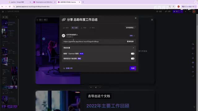不需要也不需要去额外寻找图标的资源,它系统已经内置了非常丰富的表情。等你把内容全部调整完成之后,你可以通过分享链接或者是导出文件去导出这个文档p d f或者是powerpoint的格式。但是这里需要注意,在我们没有买会员的情况下,你导出的内容可能会带有伽马的水印标记。如果不是汇报给客户的话,应该还是可以的。