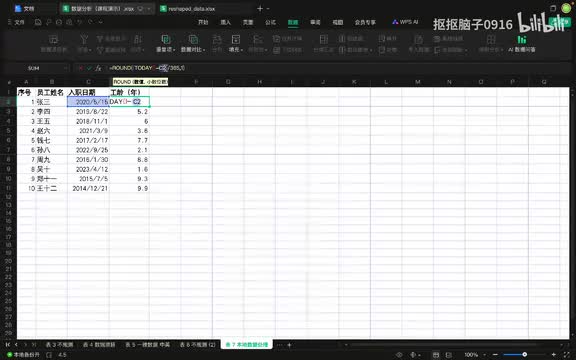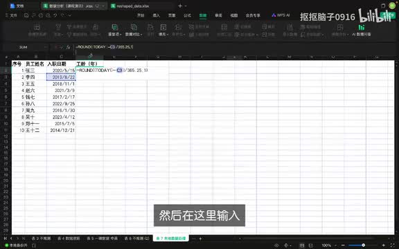 那我再试。我们可以直接把它的这个表格复制过来,然后在这里输入。看这样一下子就会出现所有人的年限,这个数据我们大家要稍微检查一下。因为你看像在这里二零一七年的工作年限是二点一年,但是二零二二年的工作年限是八点七年。