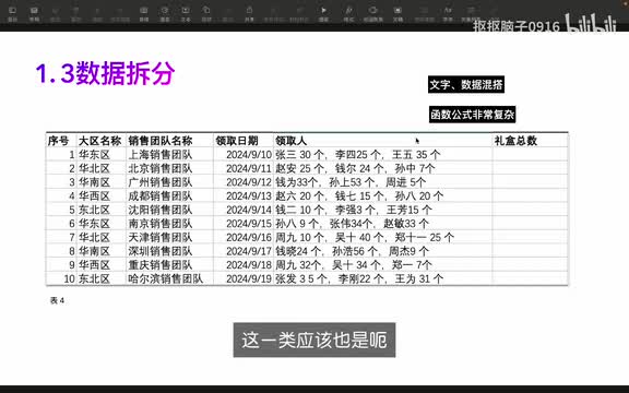 再来看一个像这种很复杂的数据,它这里有文文字,有数据的混搭。如果用函数公式的话,它会非常复杂。这一类应该也是嗯大家共享文档里面,大家各填各的属于这种。那这种我们怎么处理呢?我们等稍等去看。
