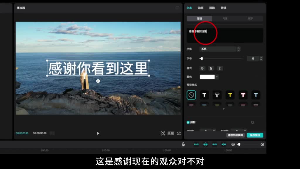 嗯,一排字,然后你把它也可以拖拽下来,上面写个默认文本。但是默认文本如果你想改这个默认文本四个字也非常简单,你用鼠标在时间线上点击一下这个文本。点击完之后你会跑到右边去看,右边是检查器的界面。我刚才已经说过,就是检查器就是检查你视频时间线上任何效果的字幕,也是其中的一个效果。那你可以在这里边把这个默认文本四个字删除打上,比如说感谢。呃,你看到这里哈,这是感谢现在的观众,对不对?把这句话打上哎就可以了。当然这个字的大小也可以随便的改变,比如说你可以在屏幕上拖拽这四个点啊,来去拖拽它的大小,然后也可以拖拽它的位置,这都没有问题。当然具体的这里边的操作有些微操作,比如说你让字幕的颜色发生一些改变,都可以有一些花字,这些不多赘述啊。这些跟你的比如说你平常办公用的那个呃word文档啊,没有本质上的区别,大家可以自己去调试。啊,我就先先放到这里啊,先放到这里。