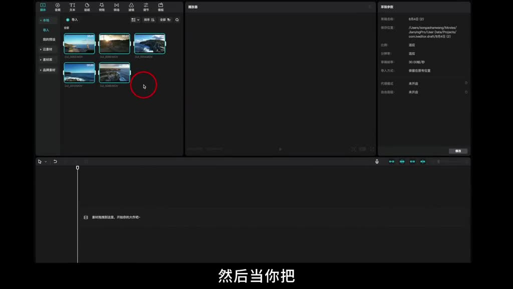这个用抖音账号登录的最大的好处就是让你可以把抖音你收藏的一些音乐啊等等的这些数据呢全部同步过来啊,然后我们直接点击这个开始创作就可以了啊,其他暂时先不用管,我今天只讲最有用的。好,那我们看到这个第一次打开的界面空空如也啊,也不用先担心。我们先看左边有一个导入啊,有个加号,这里边可以选择视频、音频和图片,我们点击一下。好,你随便在你的文件夹里选中几段素材,选中完之后点击右下角的导入。就ok了。这个时候我导入进来五段的航拍素材啊,然后呢当你把鼠标放到你这个素材上面左右滑动的时候,你就可以在中间这里去查看到啊素材本身是什么。然后我们随便选中一个素材,就把这个素材呢可以单击鼠标啊,给它拖拽到下方的时间线上来。我先给它放到这儿,咱先不急,我先一点一点给大家讲一下整体的一个界面都有什么。首先呢我们看最左边这一片区域,你可以把它理解为它是素材选择去加上效果的添加区域。你可以这么先理解着o k那中间这个区域呢它就是一个预览器的窗口。