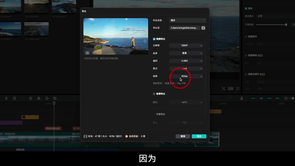 但是我建议如果你上传抖音到幺零八零,这个分辨率是足够用的,就导幺零八零。码率建议一定要选择更高,选择更高说白了就更清晰。编码h二六四你可以通俗理解为它就是各大平台,包括那个各大播放器啊,都比较通用的一种编码模式。你就默认你也先不用管它市场。格式的m p四就可以了。帧率我个人建议是选六十帧,因为我也希望你拍摄的时候都是六十帧的拍摄,这样的话你的画面其实更流畅一些。其他的你选不选都无所谓。如果你选音频导出了呃,它就除了导视频之外,再给你导出一段m p三的音频文件。方便你只听声音啊,这个无所谓啊,我建议都无所谓,不用点的。然后最后你点导出就可以了,我们点击一下导出,这个时候它会有声音,调到百分百的时候就导出完毕,你就可以把这个视频上传抖音了。