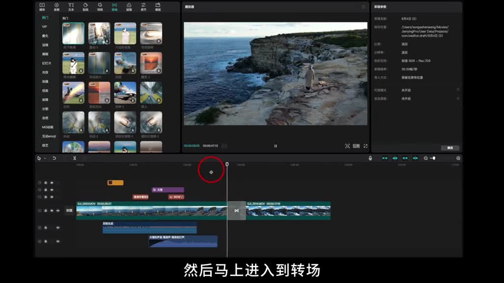 转场的意思就是在两段视频之间可以添加一些效果,然后去让他们呃做出一些这个呃变化。就是从左边场景a场景到b场景,它有一点点变化。我们点击一下这个转场。然后也是随便找一个效果吧。那比如说这是什么效果,这个这个我也不知道,你就得去播放去看啊,我们播放一下。现在这是这个视频正在播放,然后马上进入到的转场哎。啊,从上往下就这么刷了一下下来,你说刷的一下下来,这一下好不好看?这个因人而异啊。我个人是不太喜欢花里胡哨的专场的,但如果是零基础同学,你先做的花里胡哨一些,只要你觉得好玩都没有问题啊。这个放轻松,这些所有的专场我建议你。第一次做剪辑的时候全部都试一遍,哎,一定要都试一遍。