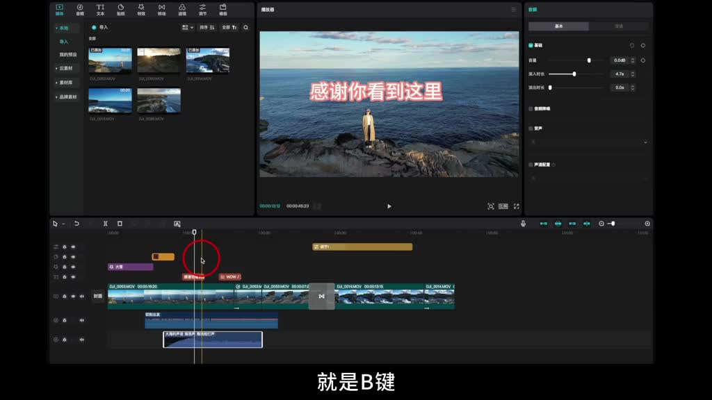 音乐下边呢还有一些音效,这也能同时给它播放出来。对,这些都是同时可以播放出来的东西。所以如果你想让视频花里胡哨,实际上说白了就是你的上下假的乱七八糟的东西就足够多。o k就这么简单。那整个的这个时间线呢呃你只需要记住一个快捷键就可以了啊,其他都不用管。就是b键b键啊a b的b啊,然后我们点击b键,它就会变成一个这个。呃,一个小刀片你就可以随意的进行剪辑,你看切到哪儿就剪辑到哪儿。然后呢你可以摁一下a键,就回到这个选择按键,可以选择你刚才剪的这个东西。你可以甚至说选择完之后点击delete键可以给它删除啊,都没有问题。如果你不想用。