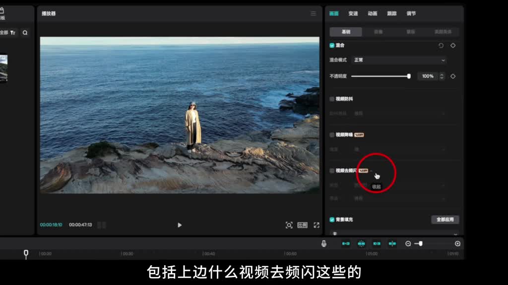 然后混合模式,这个你零基础先不用管,这个一般画中画去使用的,你先不用管啊。视频防抖这个我觉得还相对于比较实用。因为因为有的时候大家用手机拍的可能确实很陡啊。ok那视频降噪啊这些也可以去尝试使用。但是我这样给你们讲,无论是防抖啊、降噪啊,包括上边什么视频去频闪这些的呃这些的功能呃,建议大家尽量不去使用的原因是你还要基于你的原素材拍摄的好。只要你原素材拍的好。总比你后期处理的要强。背景填充一般,就比如说呃当你这个。缩放到这儿的时候,然后点击背景填充,然后选择任何一个模糊。第一个。