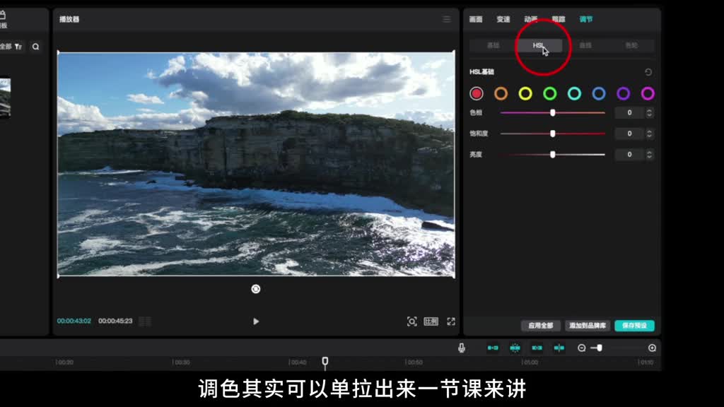 所以说大家也可以都尝试一下这些动画入场出场组合都有这个调节,跟刚才我说的自定义调节层其实是一个道理。你可以给它的亮度对比度、饱和度等等等等颜色做出一些具体的一些改变。其实调节我个人觉得更多的就是改变画质一些视频的颜色,包括h s l,这也是改变你的呃颜色的。然后包括曲线啊,包括色轮。这些都是调色的范围,调色其实可以单拉出来一节课来讲。如果你特别想听调色的话,也可以在评论区告诉我啊。我只讲一点吧,只讲一点让大家稍微理解理解其实就可以了。你比如说我们点击h s l,那这里边到底什么意思?看起来很复杂,其实很简单,比如说你看我现在的视频选项。呃,比如说我想让蓝天更蓝,就这么一件事情。那你就不要提高它整体饱和度,你只提高蓝色的饱和度就可以了呀。