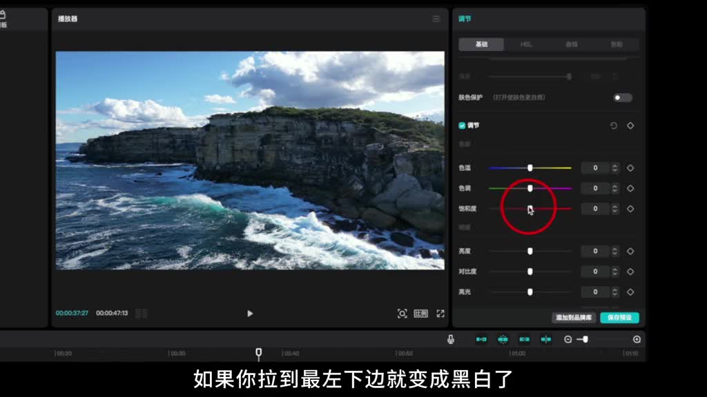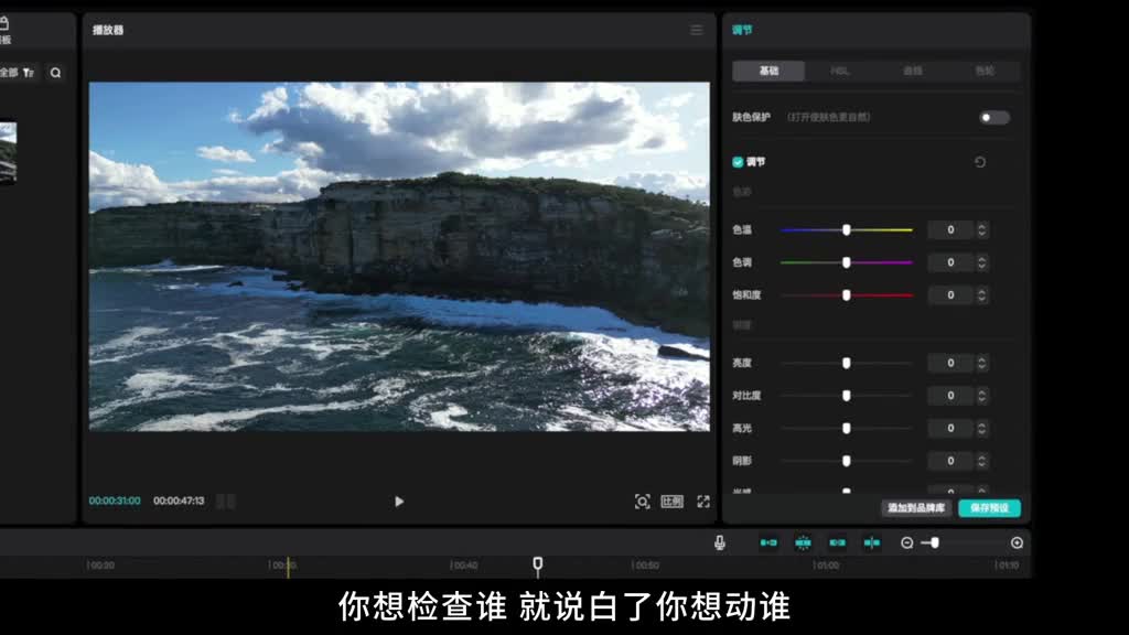所以说我们点击这个蓝色,点击到蓝色之后呢,ok然后我们就把这个蓝色看看,这写着饱和度,点击蓝色这个饱和度。你把蓝色一拉高,仔细看一下这个效果,是不是整体的蓝色就拉高了,但是其他的颜色并没有发生太大的改变,大体就是这么个意思啊,所以这个你们举一反三去练习练习就可以了。那最后呢就是我们的时间线了,整个时间线刚才我是剪的乱七八糟,这些东西你都可以随便的动一动。时间线上我再强调一下大体逻辑啊。从左往右呢你可以理解为是数学题的x轴。就是说它从左往右,它就是个时间顺序。你先放哪个素材,它就先播放哪个,后放上哪个素材,它就后放哪个素材,就这么简单啊,很无脑的一个时间的一个逻辑顺序。那么上下轴呢我们可以通俗理解为y轴。那上下轴就是我们就是把乱七八糟的效果可以上下添加在你的视频上。比如说我刚才加了一段字幕,写着感谢你看到这里,那这个字幕是不是覆盖在它的上面?能理解吧?那我下下边呢还有一些音乐,那这音乐也能播放的出来。