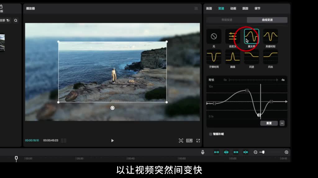 给大家看一下啊,然后它的背景就填充上去了。这个一般背景模糊用于说你的视频的比例不够统一,有的竖屏啊,有的横屏啊,所以你需要一个背景衬在后边,一般是做这件事情去使用的啊。好,那这个就不多赘述。那我们再看这还有变速,变速的话你可以让视频速度放快放慢啊,这个左右拖拽就可以了啊。然后包括你也可以让视频进行曲线变速。曲线变速呢这个在剪映里边也有,就说白了可以让视频突然间变快,然后又慢,然后又快。你可以这么理解啊,你都可以点击一下。ok然后这还有动画,动画还比较好玩,就是它能让视频动一动啊,让视频简单动一动。嗯,比如说我随便也是呃切一段视频,这段视频如果你要是选择这个动画的话,呃,比如说我随便找一个随便找一个这什么新型的这种,我们先下载一下o k你你看一下这视频效果。他感觉很奇怪啊啊,它变成这么一个动了一下,变成一个心形的动这么一下好看吗?啊,不一定好看啊,但是呃只能说比较好玩吧。