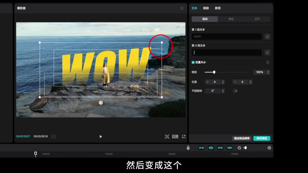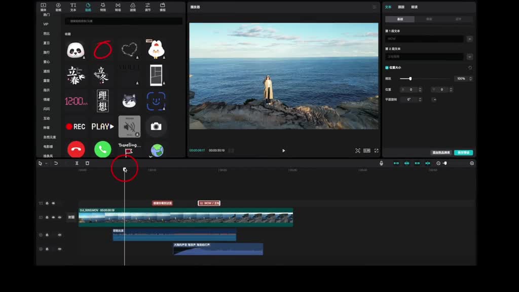 你自己说的话,那你懒得加字幕,可以点击开始识别,它就自动,它就把字幕给你打上,非常的方便,这个不多赘述啊。o k识别歌词也是一样,如果说你添加的是首流行歌曲,你点击开始识别,它能自动匹配那个歌词。这些都是为懒人做准备的啊。好,那文本讲完,我们接下来继续讲贴纸。贴纸呃你可以理解为就是一个小动画啊。比如说你看我经常用这个东西啊,嗯大家看一下,比如说这个你看这个红色的圈圈,因为有的时候我做教程可能需要说标注一些内容。比如说我让这个圈圈放到这个。陈姐的身上,然后我们播放一下,哎,就代表着这是划重点了。但这里边有非常非常多大量的小动画,你都可以去下载,然后脱下来尝试一下,这个就不多赘述啊。然后接下来说特效,特效呢你可以理解为就是给视频上面增加一点呃乱七八糟的效果啊。