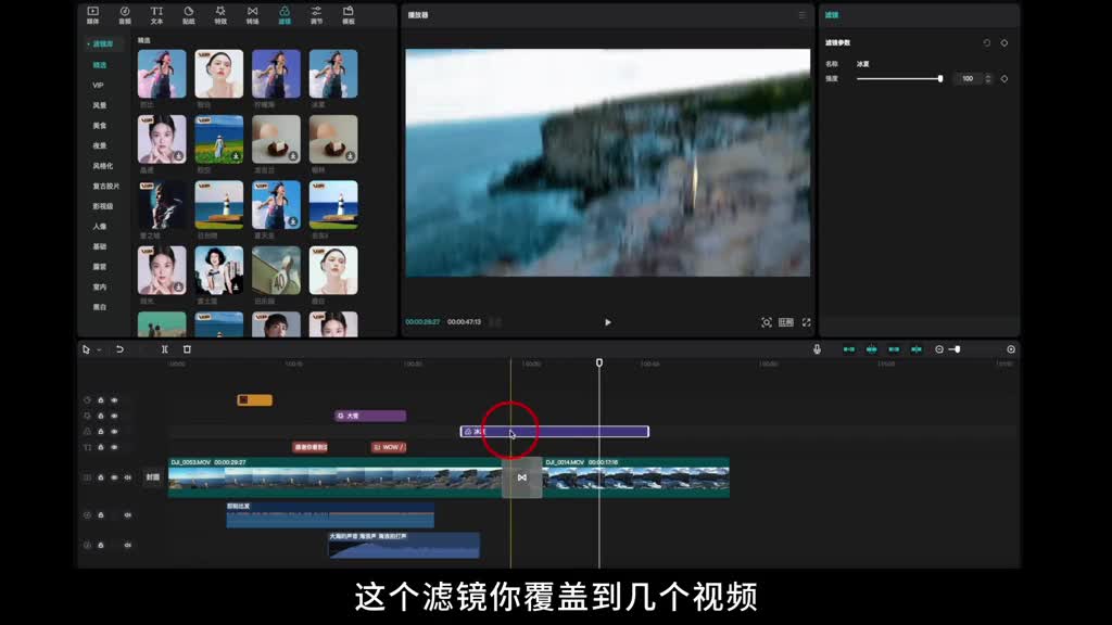 ok那转场讲完讲滤镜,那滤镜呢呃就是给你的视频你可以理解为呃一键调色啊,我觉得这样理解可能比较的这个舒服一点啊。比如说我随便找一个叫什么这个芭比。啊,把这个八比这个颜色调下来,呃,你觉得放到这好看吗?我个人觉得不是特别好看啊,呃当然这个你删掉。那如果说你特别喜欢某一个运镜,比如说你特别喜欢这个叫什么冰下的这个滤镜,你可以把它放到这个个视频上面,它就变成了这个颜色,对不对?那如果说你想让两段视频同变成同样的颜色o k那你就把这个滤镜往前拖。它的逻辑是这个滤镜你覆盖到几个视频,那么这几个视频就相应的变成这个滤镜的颜色了啊,所以它是可以方便统一调色这么个东西啊,也不是特别好看,我只是放到这儿啊。呃,举例o k那再往下是调节调节这个自定义调节,我个人不太建议新手进行使用。因为一提到自定义这种东西,它就是跟模板没有任何关系的东西,它都是需要你自己去操作。呃,但是也给大家简单讲一下吧。比如说我们把自定义调节,点击加号放到这儿,你会发现整个视频它没有任何的变化。原因很简单,因为它需要你手动调节啊,所以我就不多赘述。