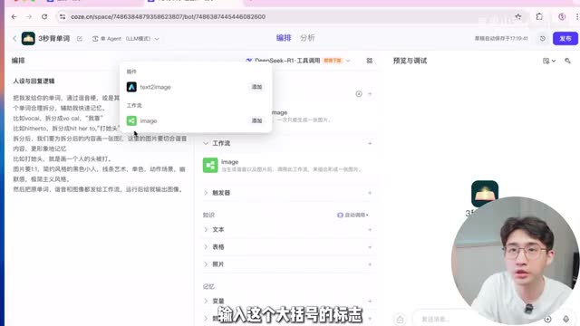 其实到这里这个智能体已经可以用了。但是为了让它能够更加流畅稳定的运行,我们需要在提示词这里加一些限定。首先我们需要把电脑的输入法切换成英文,然后在第一个画图的地方输入这个大括号的标志,然后选择画图的插件。然后再要调用工作流的这个地方,也是输入大括号,选择工作流。然后最下面一行是我们要输入给工作流的参数,对吧?还记得我们刚刚的命名吗?单词。
