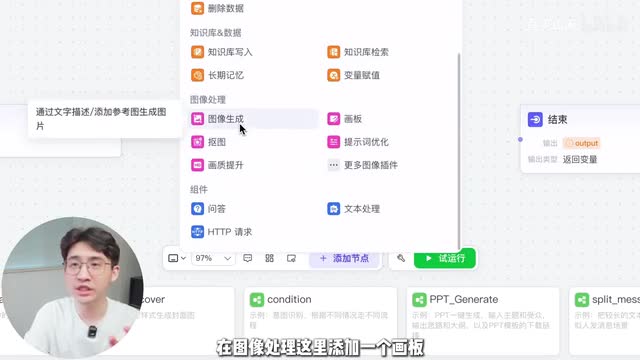 你们可以直接复制我这套提示词,当谐音梗以及图片生成以后,调用这个工作流来组合成一张图。这个就是工作流的编辑画板。大家不要觉得它复杂,其实很简单,我们点击这里的添加节点啊,往下滑,在图像处理这里添加一个画板,加一个抠图。咱们一个一个说哈,首先是抠图节点。就是当我们前面a i把图片给画出来以后,我们最好是把图片的背景给抠掉,这样出来的效果是最好的。