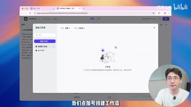 但我们还差最后一个环节,就是把我们的单词、谐音梗还有图片给它拼接到一张图上。那这个时候我们需要添加一个工作流,我们点加号。创建工作流。随便起一个名字,工作理由描述这里要好好写。你看他这写的让大模型理解什么样的情况下可以调用这个工作理由。