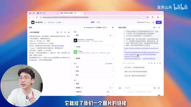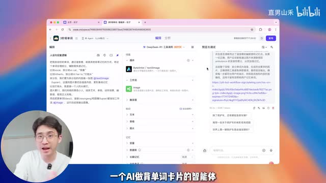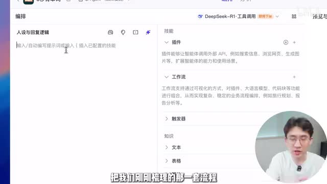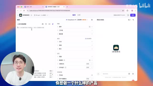 并且这是目前市面上唯一支持deep sk e q的平台。确定好模型以后,我们来看一下这个智能体编辑页面的界面分布。一共分为三个部分,左侧是提示词区域,你在这里写提示词,你想做一个什么样的产品,然后需要它有什么样的功能。中间板块是技能部分,比如你可以在这里调用插件,调用工作流等等。cos的生态很丰富,你点击左边这个加号,点进去里面就有特别多现成的工作流和插件供你使用。