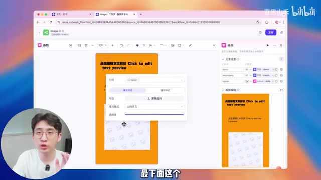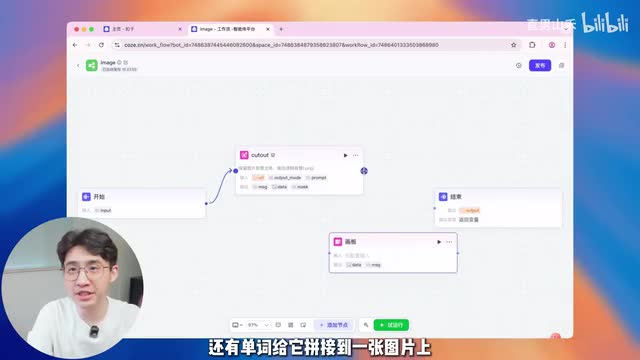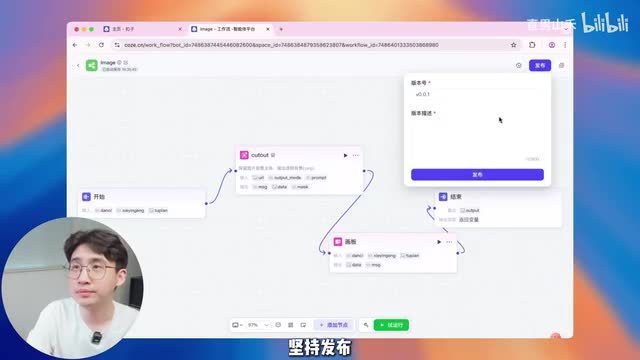 我们点一下输出,这里的话我们要选择刚刚画板合成的那张图。选择这个图片全部调完以后,我们点击右上角的发布按钮,坚持发布。版本描述随便写一个。发布成功了,我们点确认添加到当前的智能体。我们刚刚创建的工作流就在这里了。