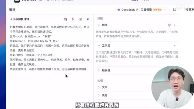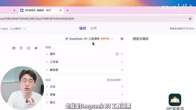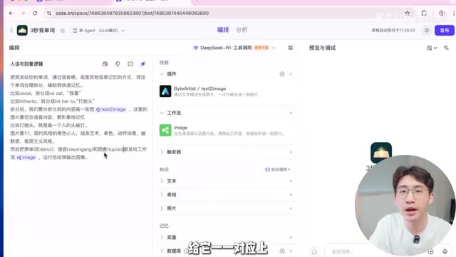 在这个板块你可以给智能。附加不同的能力。最右侧是预览区域,当你设置完一个智能体以后,你可以在这里进行调试预览。讲完各个区域的功能以后,我们开始实操本视频我们就以背单词的图文当案例来演示。如果你想要做养生成长类的图文,方法都是一样的,整套流程是这样的,首先我们发一个单词给智能体,然后deep sik帮忙把这个单词拆解成谐音梗或者是其他方便记忆的形式。