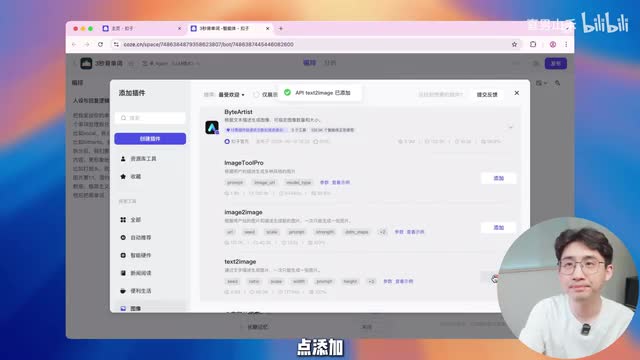 我们在插件这里点击加号,这里有很多图像生成的插件。我测试下来官方的这个插件不错,我们就直接用官方的点一下它,下面会弹出来三个选项,然后这里面有图生图,这里有纹身图,我们选最下边的这个纹身图,点添加。好,关掉刚刚选择的插件就添加好了。这到目前为止,我们靠这个提示词和这个插件已经能完成前面这几步。首先是把单词给拆分,然后把拆分出来的谐音给给画成图。