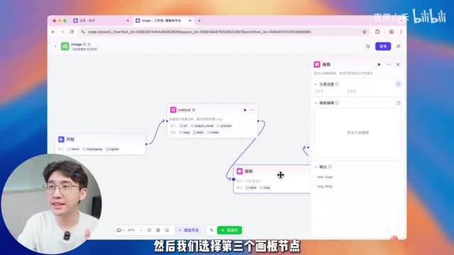 把鼠标放在这里有一个小圆圈,我们把两个节点给连起来,然后画板节点也是一样的。当我们把图片抠出来以后,最后一步就是要把抠出来的图片,还有谐音梗,还有单词给它拼接到一张图片上。这个就要用到画板的节点啊,也是连起来。最后跟这个结尾节点连起来就大功告成。我们先双击这个开始节点,然后再输入项。