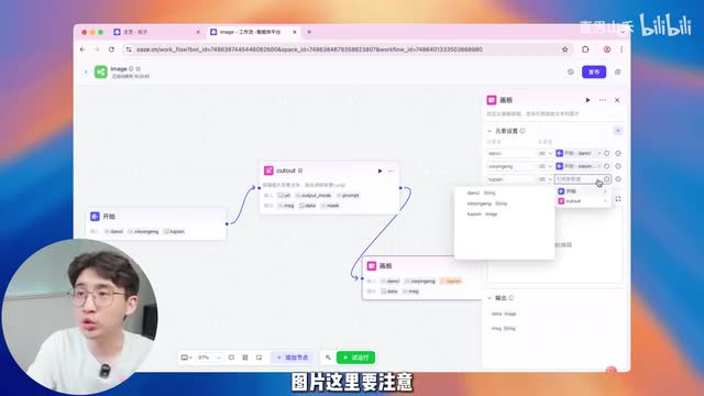这里添加两个,什么意思呢?就是我们前面会有三个数据输入到这个工作流里,分别是单词,还有谐音梗,还有图片,对吧?那我们要依次把这三个数据输进来。首先第一个单词我直接用拼音了哈,谐音的图片把这个必选给勾上。前两个单词跟谐音梗的这个变量类型不用动,这个就是字符串最下面图片这个变量类型,我们要给它改一下,选到最下面文件里面找到图像这个类型关掉。然后我们选择第二个抠图节点,我们只需要把输入这里改一下,点这个齿轮,把输入给它改成开始节点里面刚刚我们上传的那个图片就行了。这就意味着我们在外面的智能体把图片生成以后,它会把图片传到工作流里面。